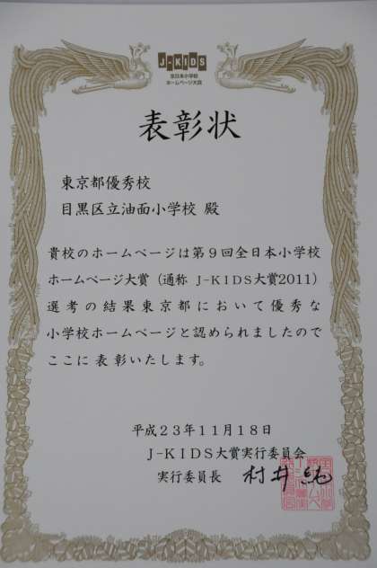 油面小学校のホームページが「第9回全日本小学校ホームページ大賞」選考の結果、東京都の優秀な小学校ホームページとして認められ、賞状が届きました。