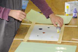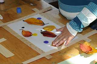 色を付けた台紙に、葉っぱを貼り付けています。