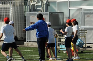 今日は、健康トレーナーの来校日です。体育の授業の支援や、休み時間、放課後の運動遊びを子どもと一緒にやっています。