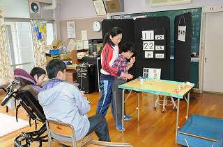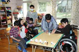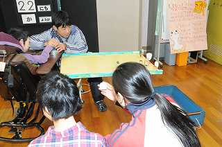 ビー玉を使って、交代でドッジボールをしています。