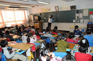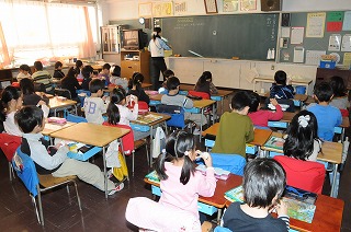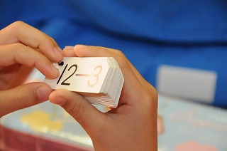 担任が「なかよくなかまわけ」の準備をしている間に、カードを使ってひき算の練習をしています。