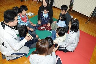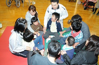 わかたけの職員が2組の授業を見て、うた・リズムの望ましい指導法の研究をしています。