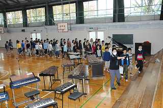 体育館に楽器を運び、これから連合音楽会までは体育館での練習が多くなります。