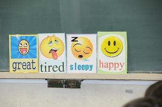カードの色を英語で言って、表に書いてある言葉を確認しています。