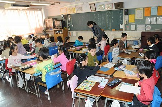 自分たちで作った自動車図鑑を、班の中で回し読みしています。