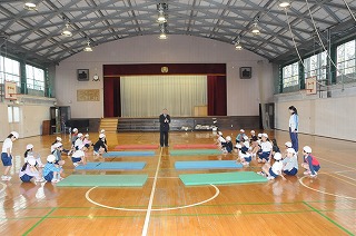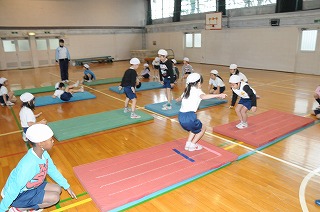 マットで前ころがりをした後、立って足ジャンケンをしています。