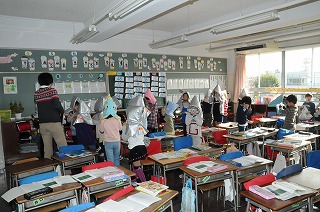 火災を想定した避難訓練です。教室で放送を聞いた後、避難を始めました。