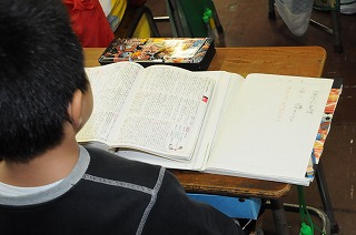 辞書を使って、漢字の意味を確認しています。
