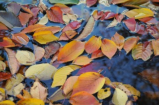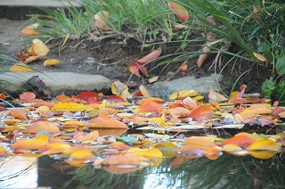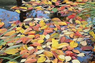 色とりどりの落ち葉がビオトープの池に浮かんでいます。