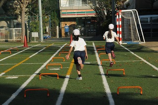 ミニハードルを走る横で、普通に走る子が少し遅れてスタートしています。競走です。