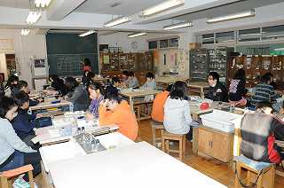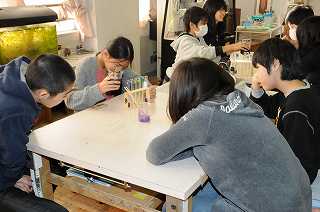 紫キャベツを使って、水溶液の性質を探る実験をしています。