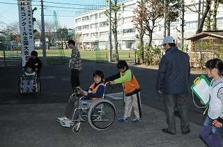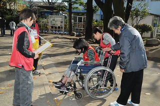 車いす体験をしています。いろいろな道路の状況を想定して車いすで通っています。