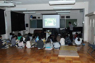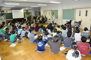 車いす体験をします。1組が始めに車いす体験をし、2組がビデオを見ています。