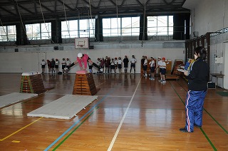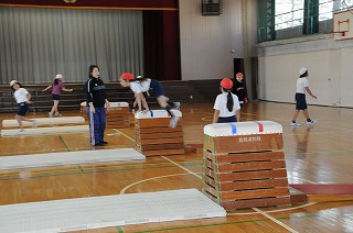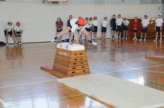 これまで練習してきたとび箱の開脚跳びをみんなの前で披露しています。