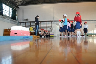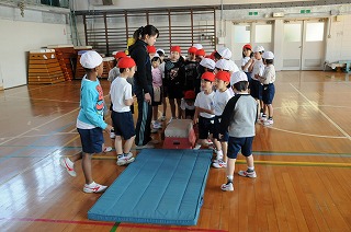 とび箱の準備の仕方をひとつひとつ確かめています。