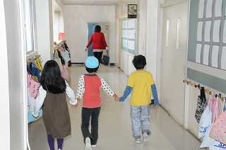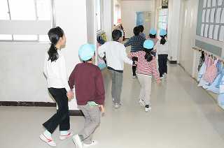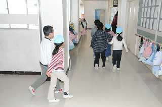 園児が、油面小に到着しました。1年生が教室に案内しています。