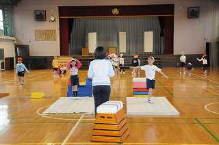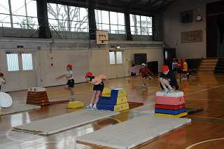 いろいろな跳びこし方で、とび箱を跳んでいます。