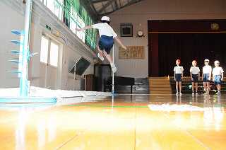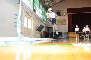 リズムよく踏み切ることができるように気を付けながら高飛びの練習をしています。バーの代わりにゴムを使っているので、子どもたちは思い切って練習することができています。