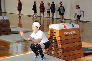 台上前転の練習をしています。