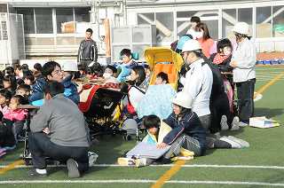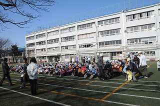 地震を想定した訓練で、校庭に避難しました。