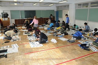 広い教室に移動し、書き初めの練習をしています。