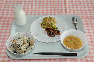 今日はかみかみメニューです。一口で30回を目標によくかんで食べましょう。