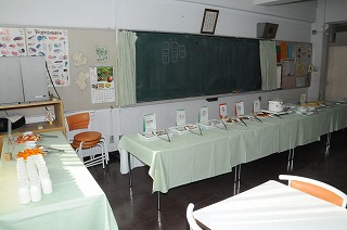 家庭科で学んだことをもとに、ランチルームでバイキング給食をいただきます。栄養のバランスを考えてメニューを決めています。