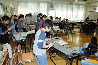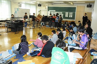 5年生が合同で「旅立ちの日に」の合奏の練習をしています。