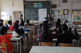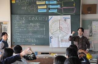 家庭科で栄養士から食べ物の大切さを学んでいます。