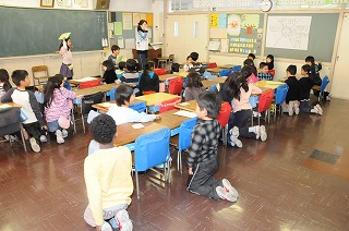 1年2組の子どもたちが教室で準備をしています。