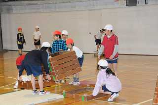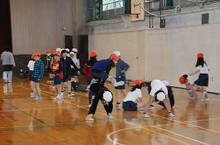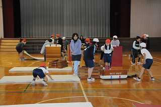とび箱の準備を協力して行っています。終わった斑から準備運動をしています。