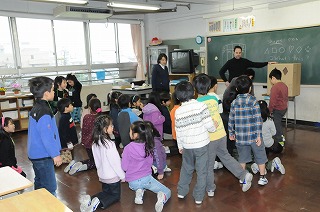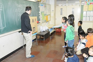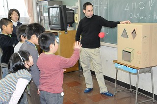 子どもたちがよく知っている図形を英語で言い、ゲームで楽しんでいます。