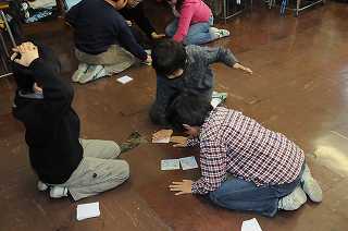 地域について調べ、作ったカルタを使ってゲームをしています。ルールは百人一首と同じです。
