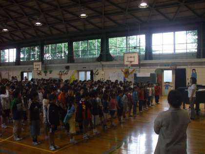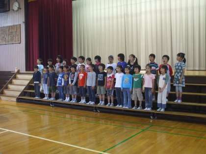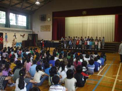 5,6年生が校外学習で不在のなか、1〜4年生で音楽集会を行いました。