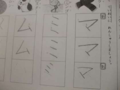 片仮名「マ」、「ミ」、「ム」を学習しました。
