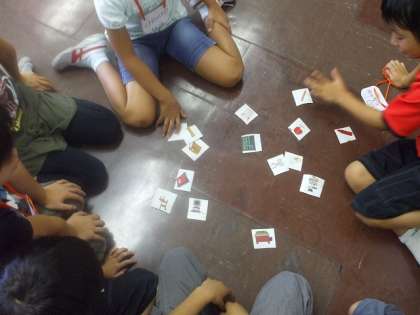 班に分かれて英語カルタをやりました。