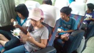 10:35 勝浦海中公園を出発し鴨川シーワールドに向かいます。バスの中で子どもたちはアイスクリームを食べています。