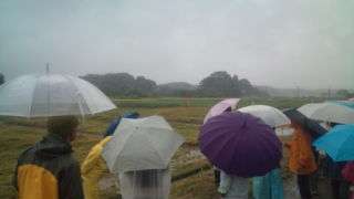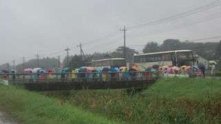 10:00 田んぼに到着しました。昨夜の雨で田んぼに水がたまり稲刈りができないために周辺を散策しながらお話を聞いています。