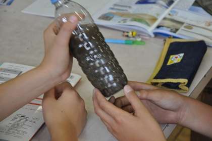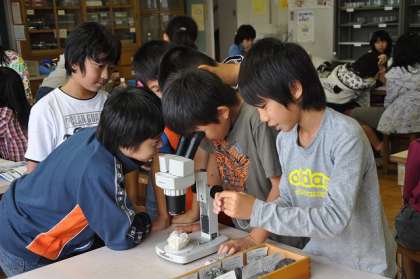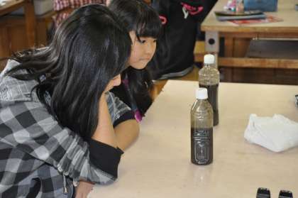 水を入れた後はしばらく待ちます。事前に一人一人がたてた予想通りになるでしょうか?待っている間に、火成岩と堆積岩の表面を顕微鏡で観察しました。