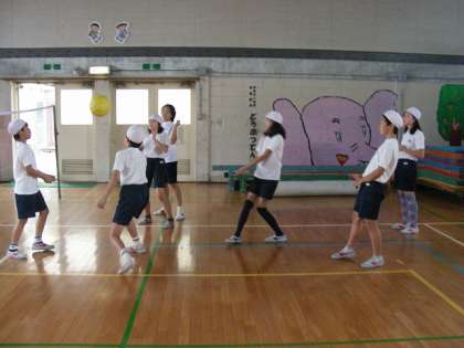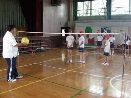 バレーボール型でボールが柔らかく、ネットやコートはバドミントンと同じです。