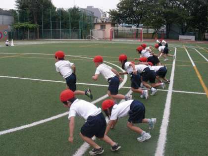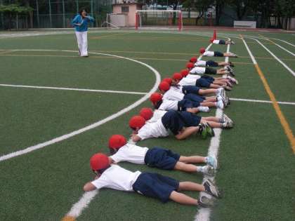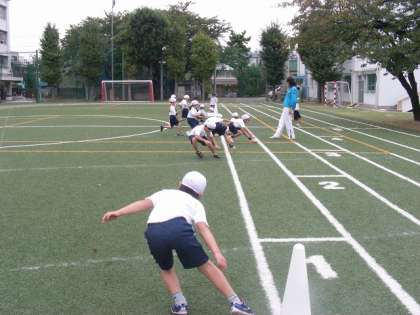 線と線の間を行って帰ってくる運動をしました。仰向けやうつぶせになるなどしてスタート時の体型を変えて行いました。