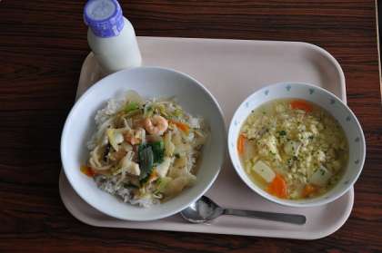 中華丼に入っている白菜は中国原産で、日本では明治になって栽培されたが、全国的に作られるようになったのは大正時代の終わり頃からです。今から冬にかけておいしくなります。今日の白菜は青森県からにました。中華丼に20kg使っています。