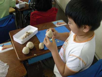 ペットボトルと粘土を使って人形を作っています。