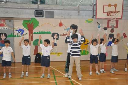 最初に一緒にダンス「キセキ」を踊りました。その後、「おみこしワッショイ」や「くぐって、跳んで、転がって」などの競技の練習を行いましたが、2年生からの大声援の中で子どもたちは気持ちよく、そして張り切って練習に取り組むことができました。