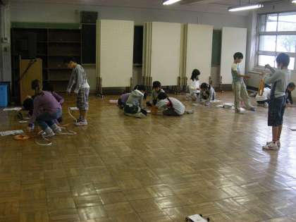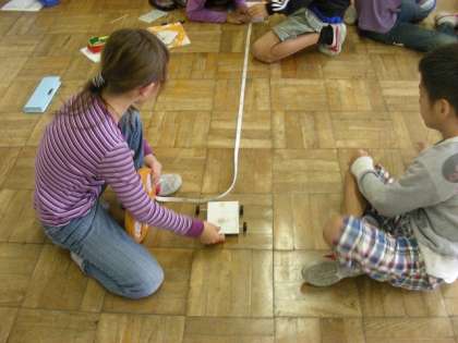 「ゴムの伸びの長さを変えると自動車の走る距離はどうなるか」実験しました。