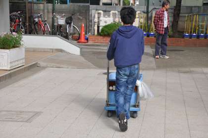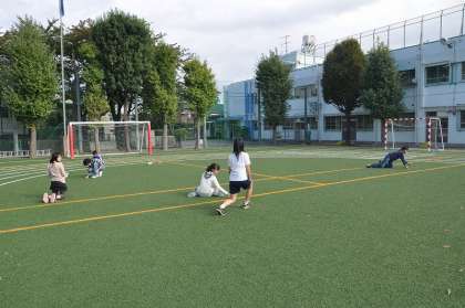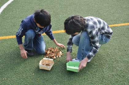6年生が人工芝の落ち葉ひろいをしています。ほうきでは掃けないので、根気よく手でひろっています。