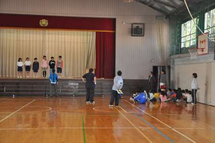 各学級とわかたけ学級の係の子どもたちが集まり、85周年記念集会でおこなうクイズの打ち合わせと練習をしました。