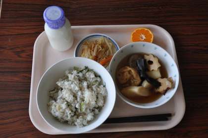 今日の菜めしに大根の葉を使いました。11月3日に八百屋さんが山梨県に行って収穫した大根です。大根の葉を茹でて調理してご飯に入れました。大根はおでんの中に入っています。