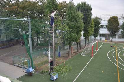 校庭の木の剪定を用務主事が進めています。(11/5の作業)