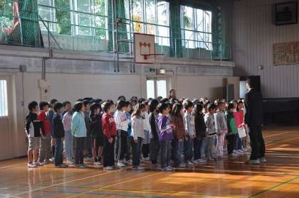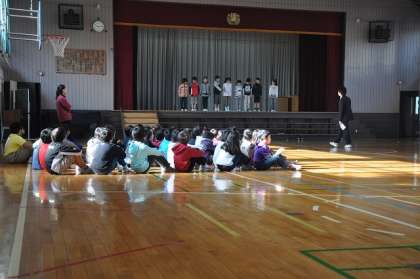 体育館で85周年記念集会の呼びかけ練習を行いました。全校練習でも3年生が一番大きな声ではっきりと呼びかけができていました。さらに磨きをかけました。